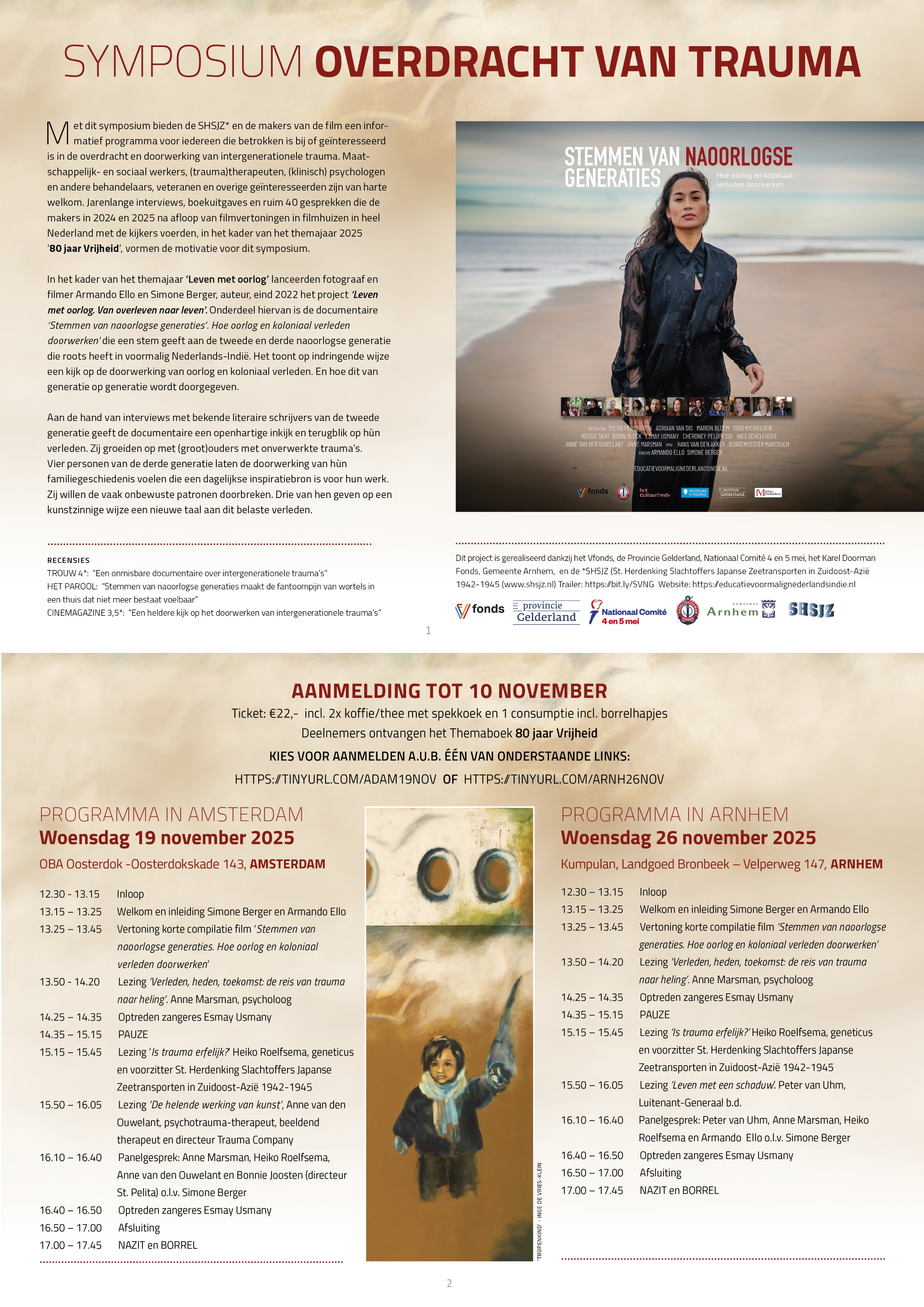Met dit symposium bieden de Stichting Herdenking Slachtoffers Japanse Zeetransporten en de makers, Simone Berger en Armando Ello, van de film 'Stemmen van naoorlogse generaties. Hoe oorlog en koloniaal verleden doorwerken' een informatief programma voor iedereen die betrokken is bij of geïnteresseerd is in de overdracht en doorwerking van intergenerationele trauma.