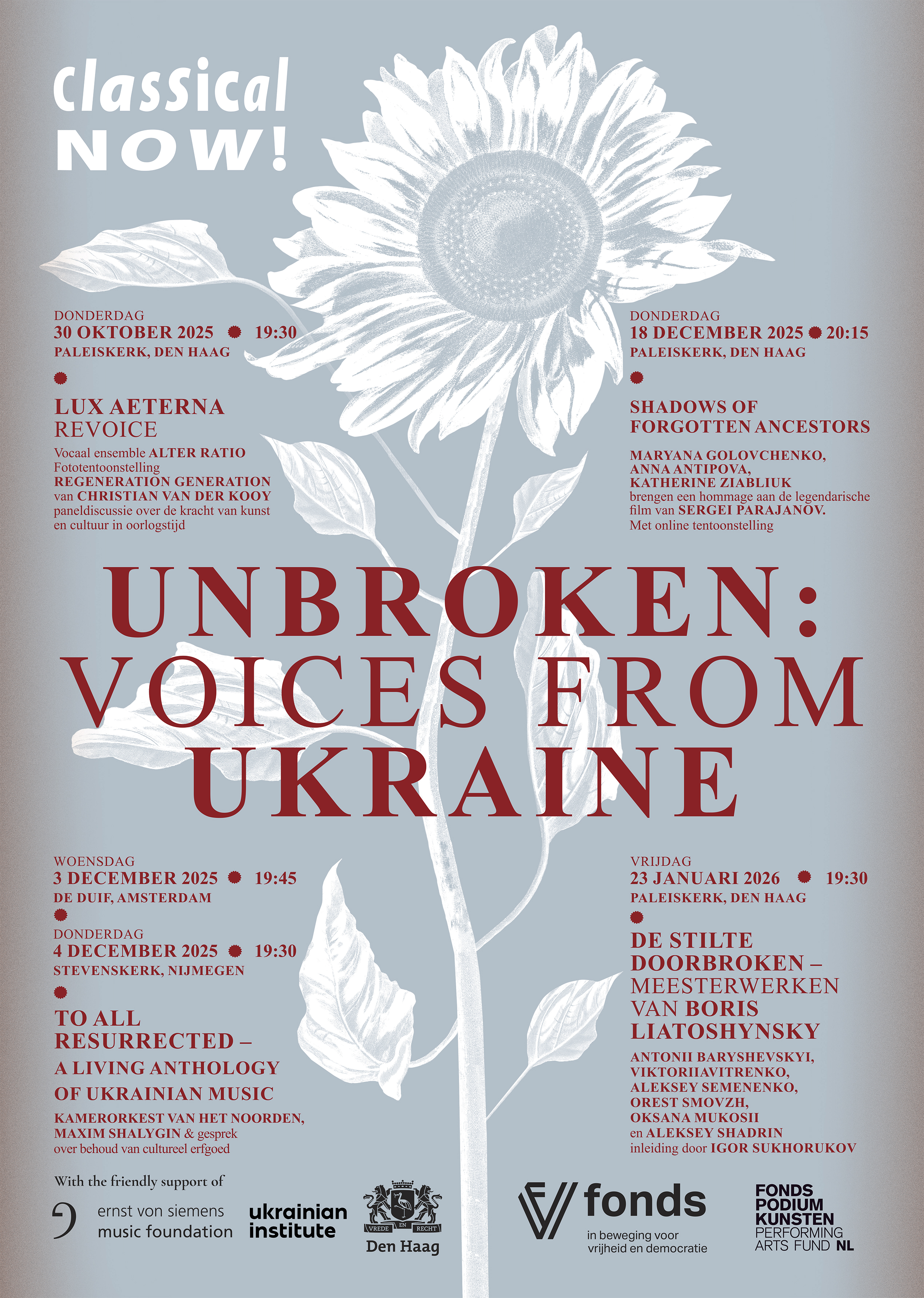 ‘Unbroken: Voices from Ukraine’ is een vijfdelige landelijke serie concerten van Classical NOW! (30 oktober 2025 – 23 januari 2026, Den Haag, Amsterdam, Nijmegen) die de rijkdom en veerkracht van de Oekraïense muziekcultuur belicht.