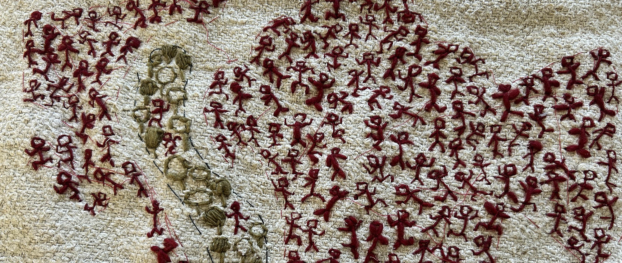 De textielkunstwerken maken de harde verhalen zacht. Aangevuld met bijzondere kaarten en tekeningen van emoties en herinneringen.